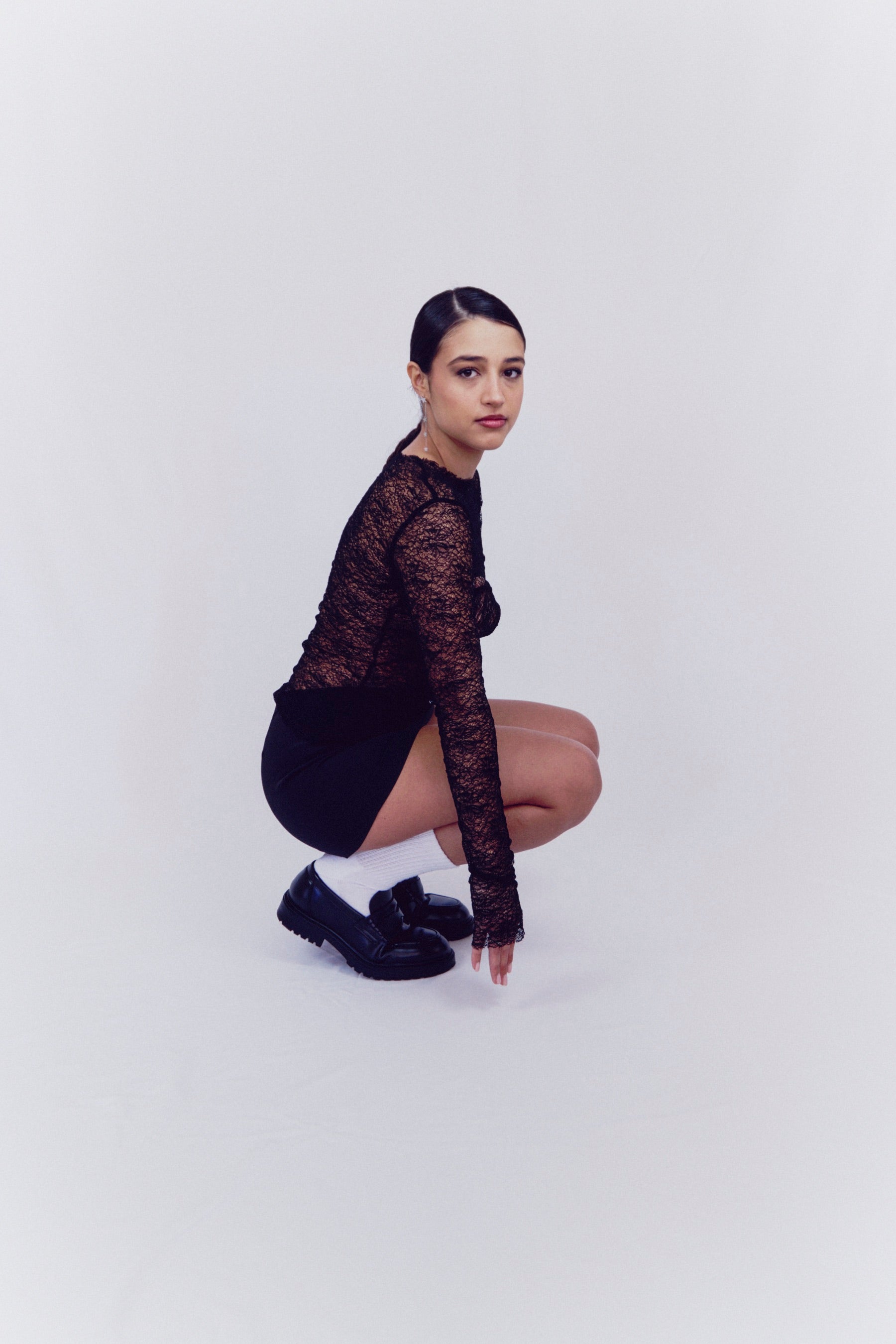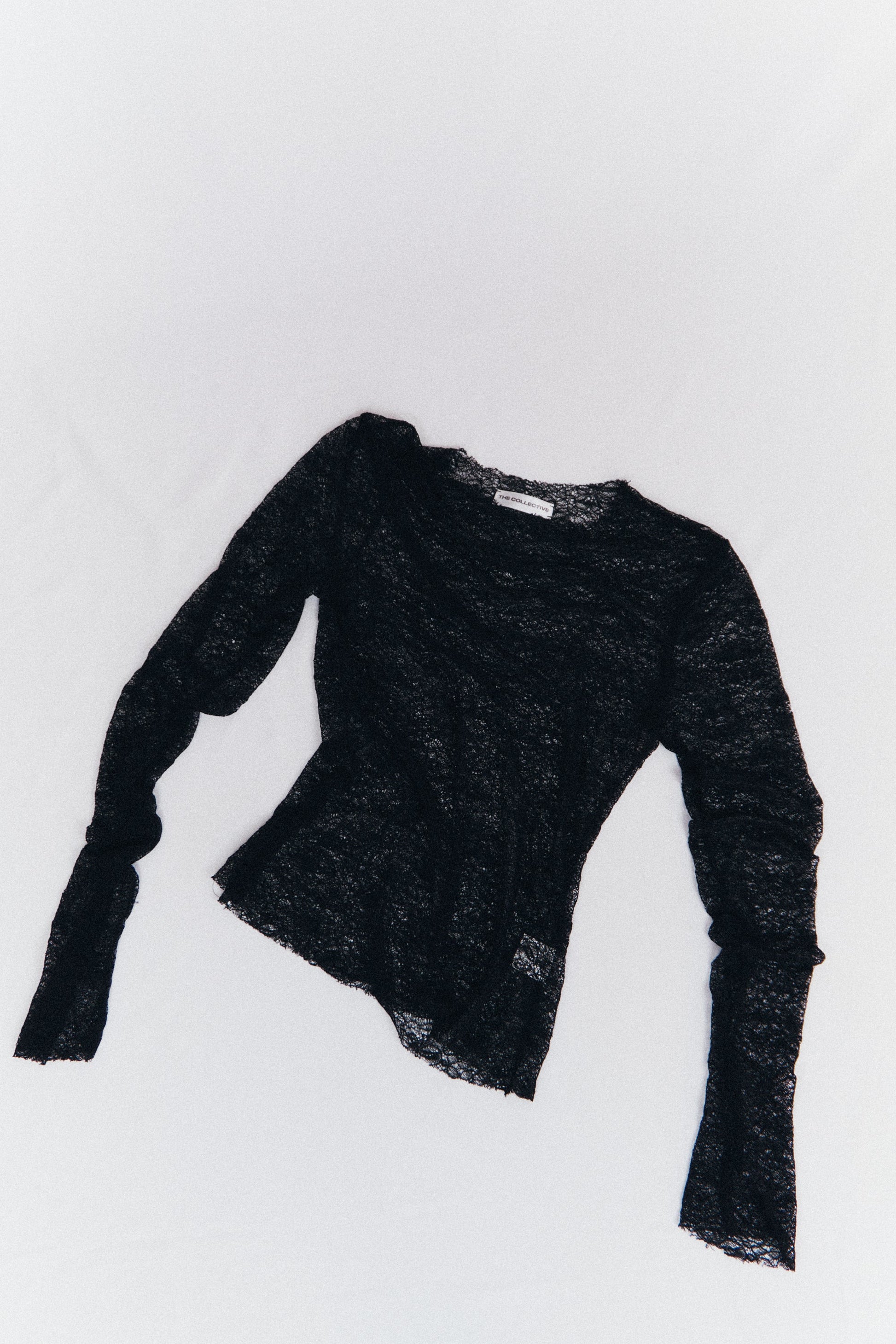 Top aderente a maniche lunghe in tessuto elasticizzato leggero e trasparente con motivo floreale.