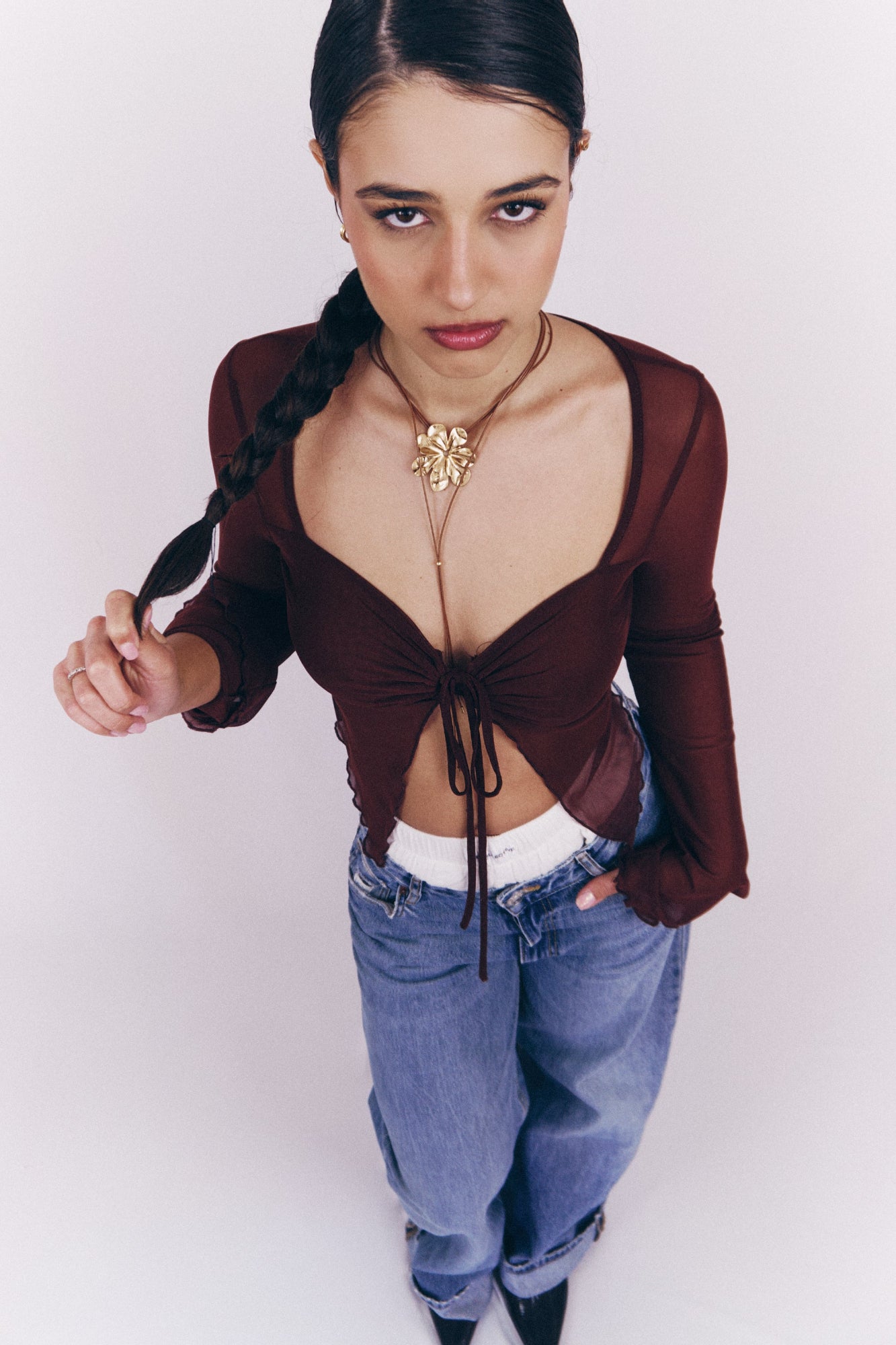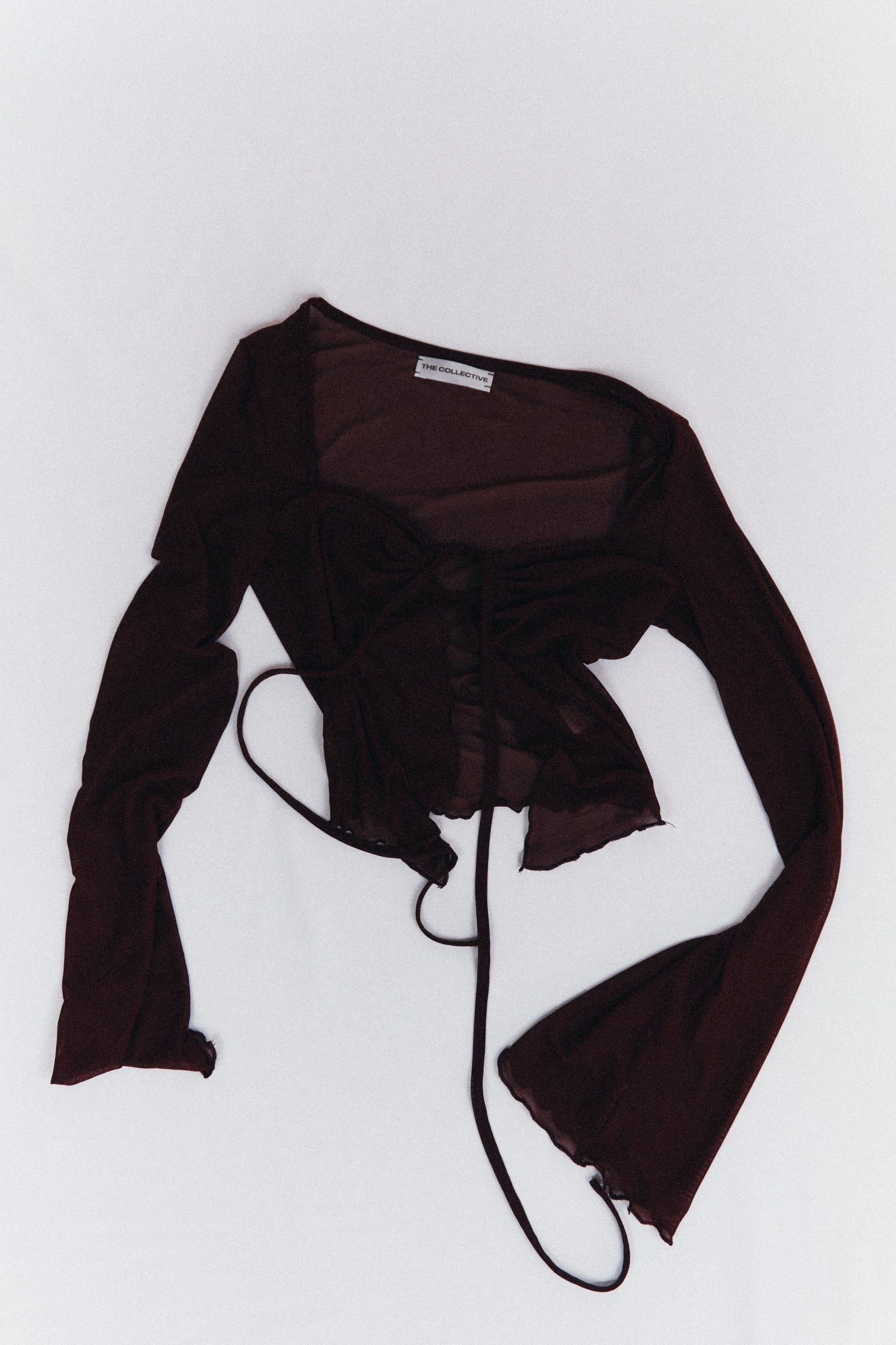 Top aderente a maniche lunghe in tessuto elasticizzato leggero e trasparente con scollo profondo e arricciatura regolabile sul davanti.