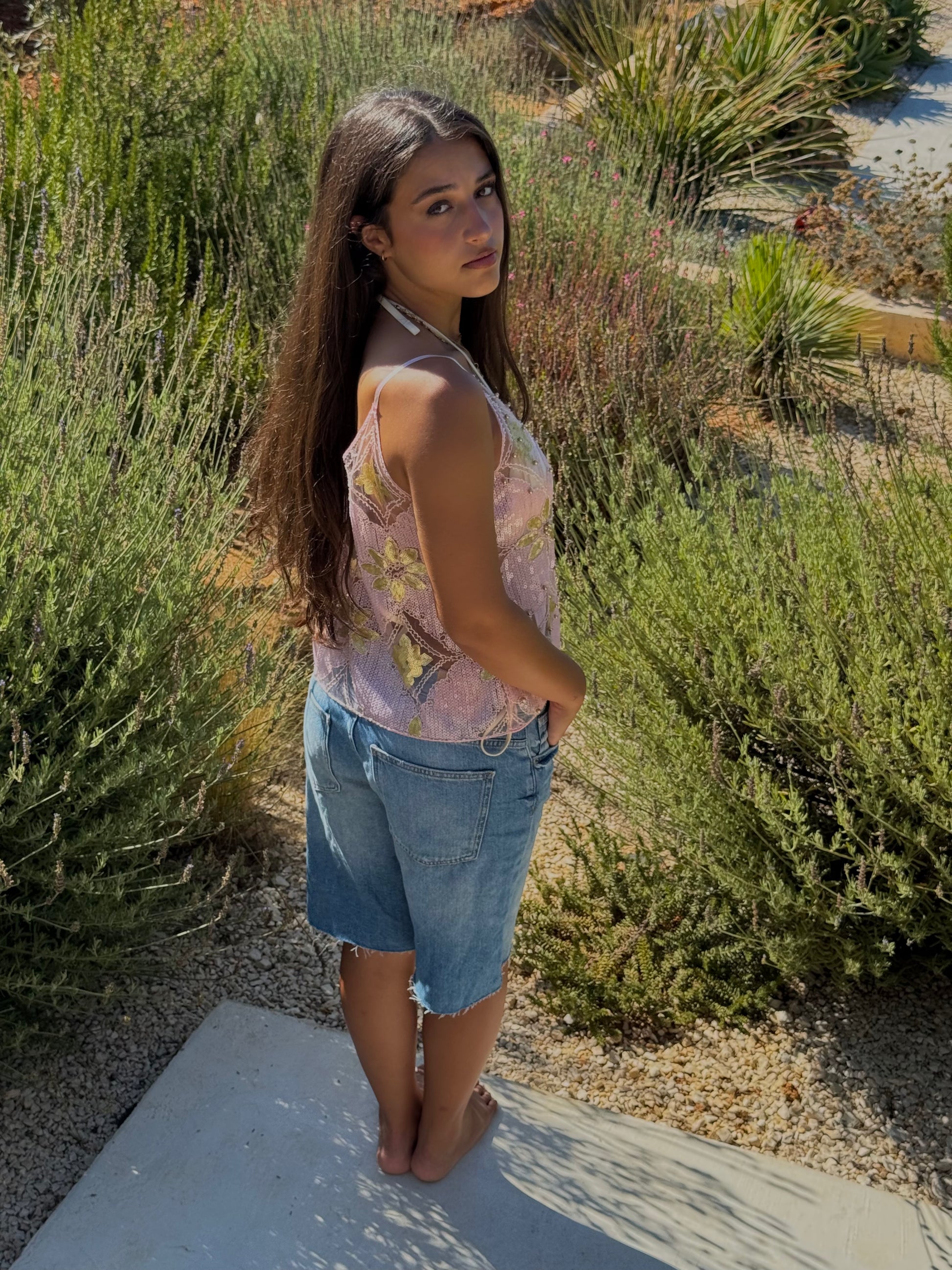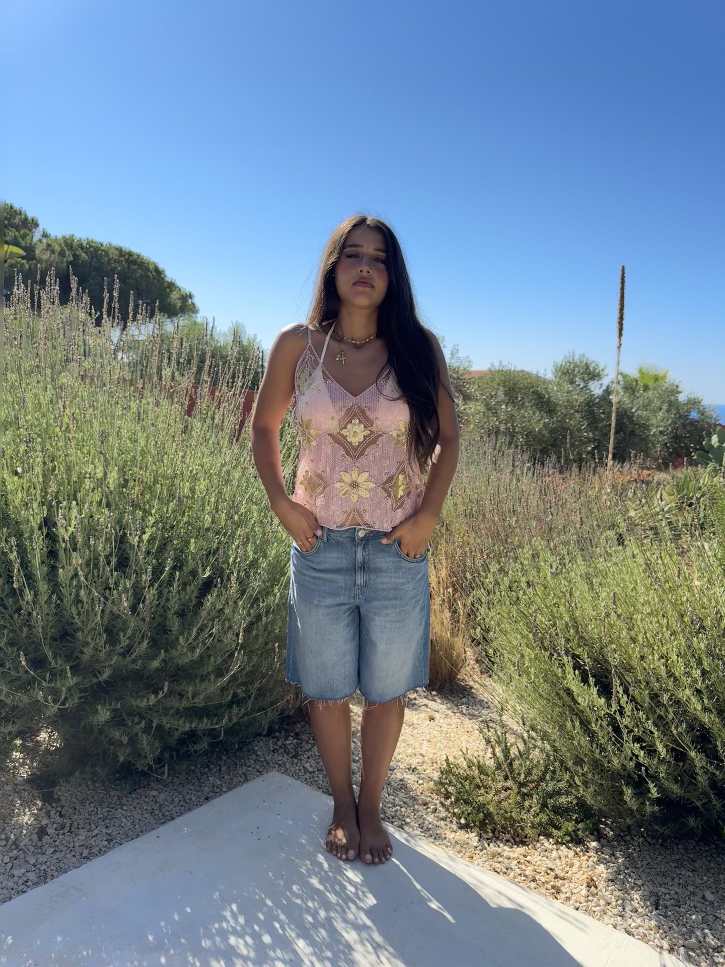 Top in tessuto leggero trasparente, interamente ricamato con paillettes e perline. Scollatura a V e spalline sottili. Disponibile in tre varianti colore: Oro, Nero e Rosa. Taglia unica.